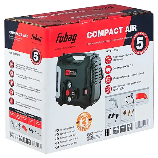 Купить Безмасляный компрессор FUBAG Compact Air + набор из 5 предметов в Томске легко — просто позвоните по телефону: 8-800-551-11-01