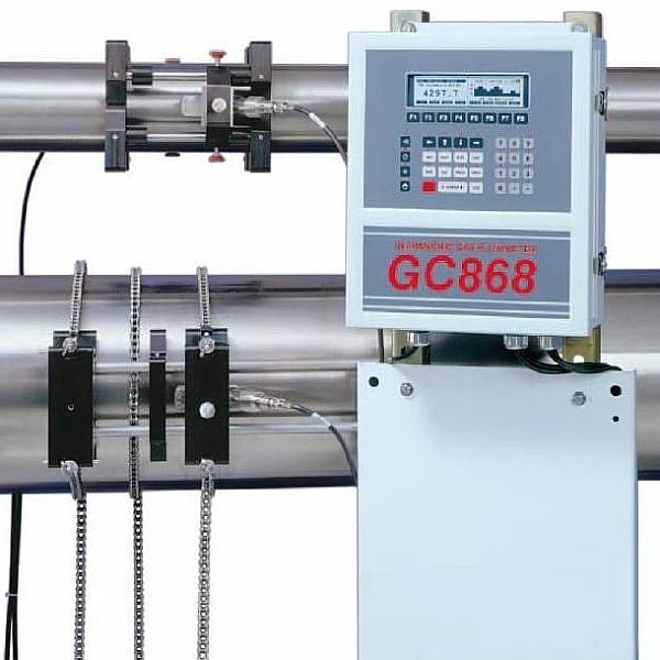 Монтаж прибора не вызывает потерь давления в трубопроводе. Расходомер GC868 имеет очень широкий динамический диапазон. Эта новейшая технология позволила расширить применение накладных ультразвуковых преобразователей в область измерения расхода газов. Система GC868 включает в себя электронный блок, пару новых ультразвуковых накладных преобразователей для газов, предусилитель и монтажные приспособления для установки преобразователей на трубопроводе.