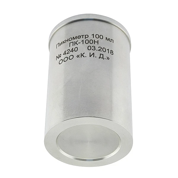 Пикнометр емкостью 100 мл., изготовленный из нержавеющей стали, представляет собой стакан с притертой крышкой, на которой имеется отверстие для выпуска излишков испытуемого материала. Пикнометр изготавливается из твердого алюминиевого сплава с низким коэффициентом температурного расширения.