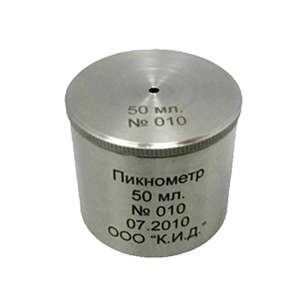 Пикнометр емкостью 50 мл., изготовленный из нержавеющей стали, представляет собой стакан с притертой крышкой, на которой имеется отверстие для выпуска излишков испытуемого материала. Пикнометр изготавливается из твердого сплава с низким коэффициентом температурного расширения.